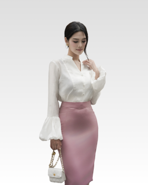 Áo sơ mi cổ trụ bẻ phối vải silk Hàn và ánh tơ — sản phẩm được phối trong look này