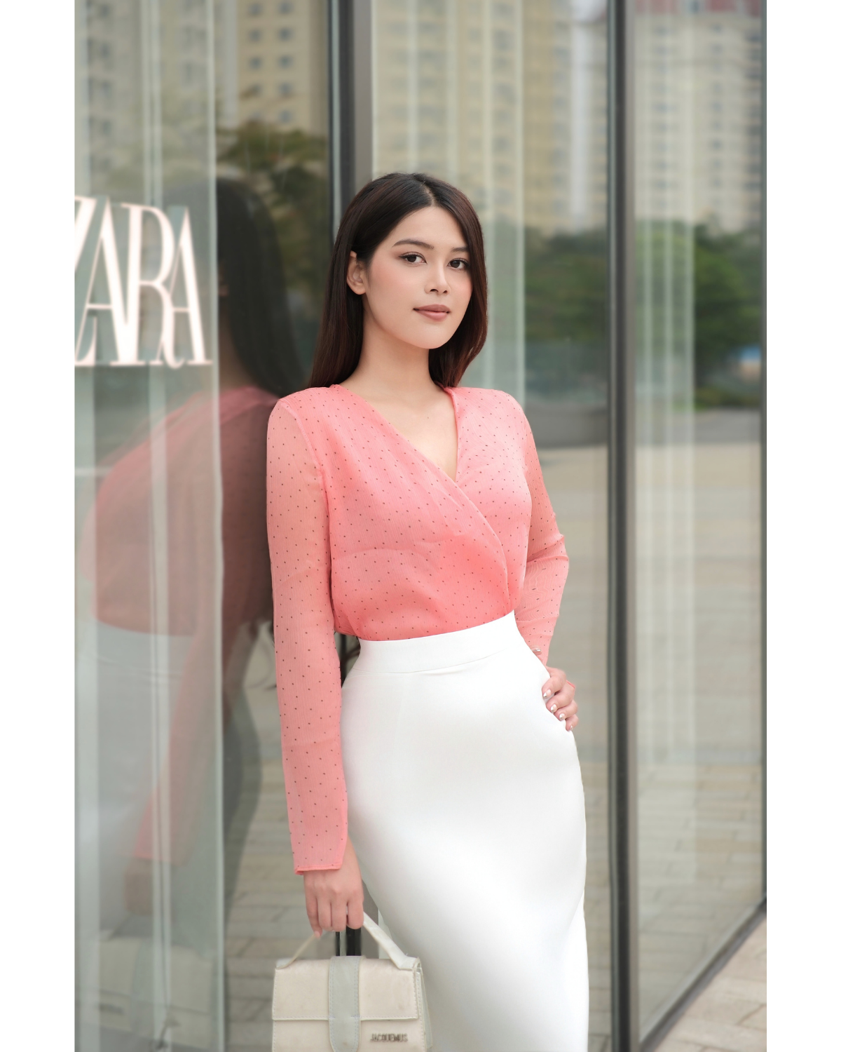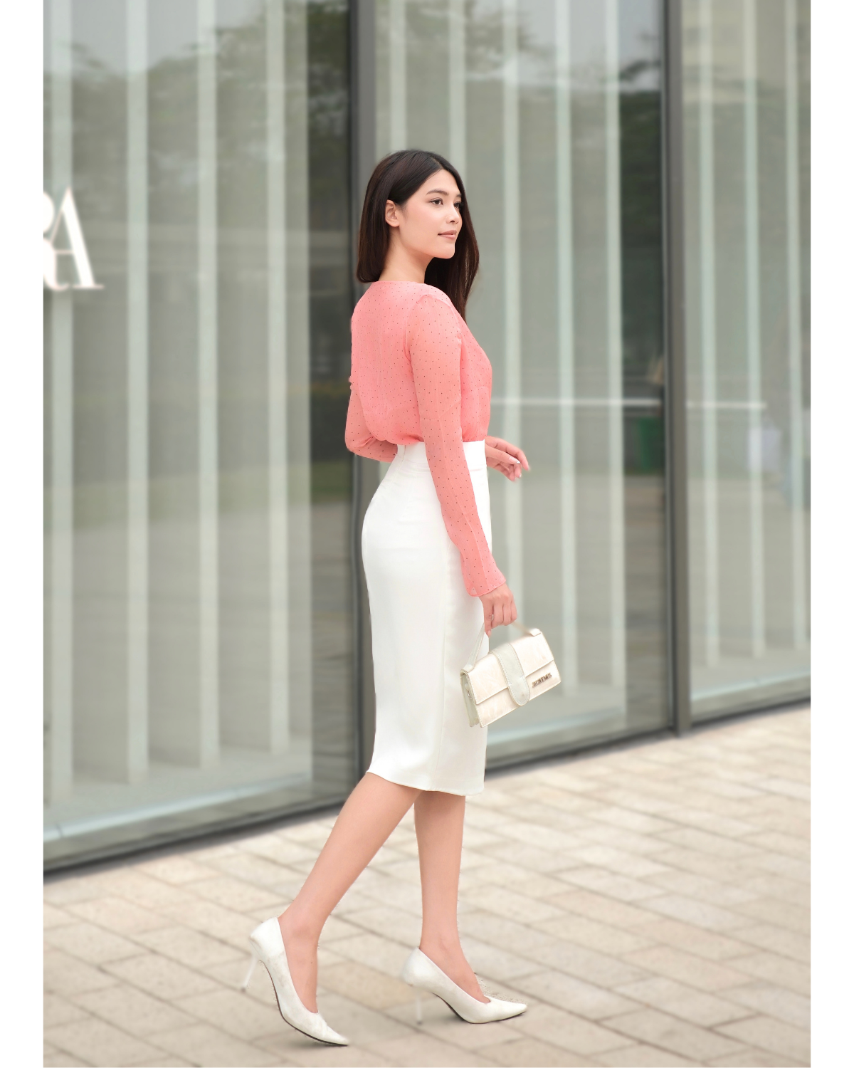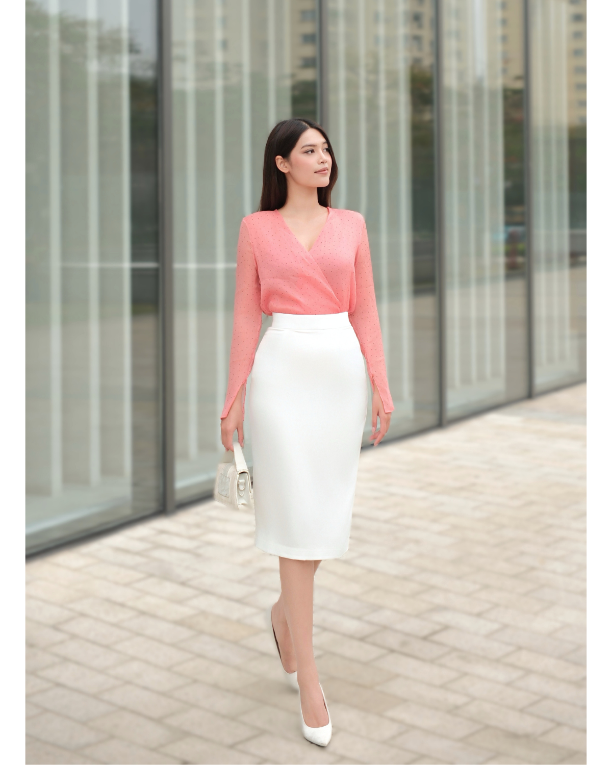 Chân váy bút chì lụa xẻ sau (2 lớp) — sản phẩm được phối trong look này