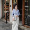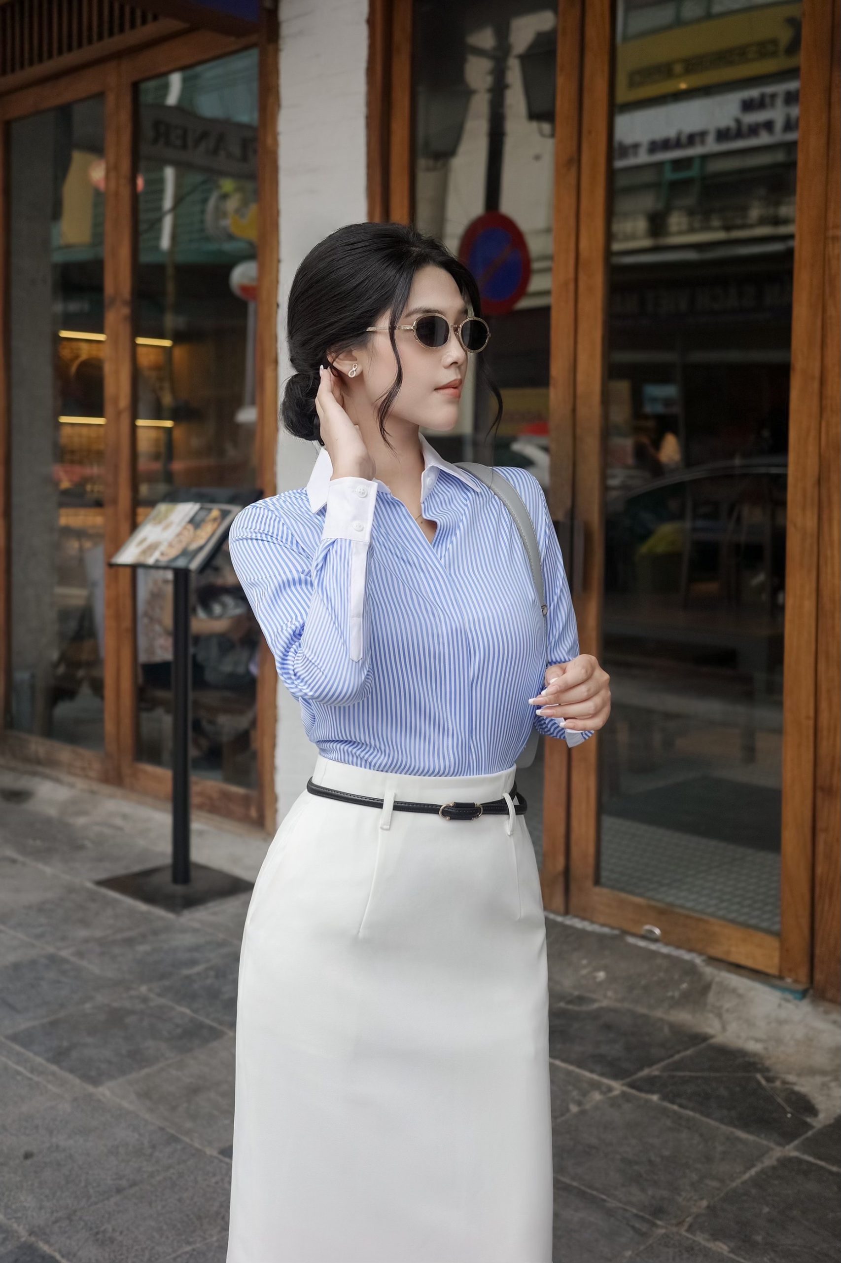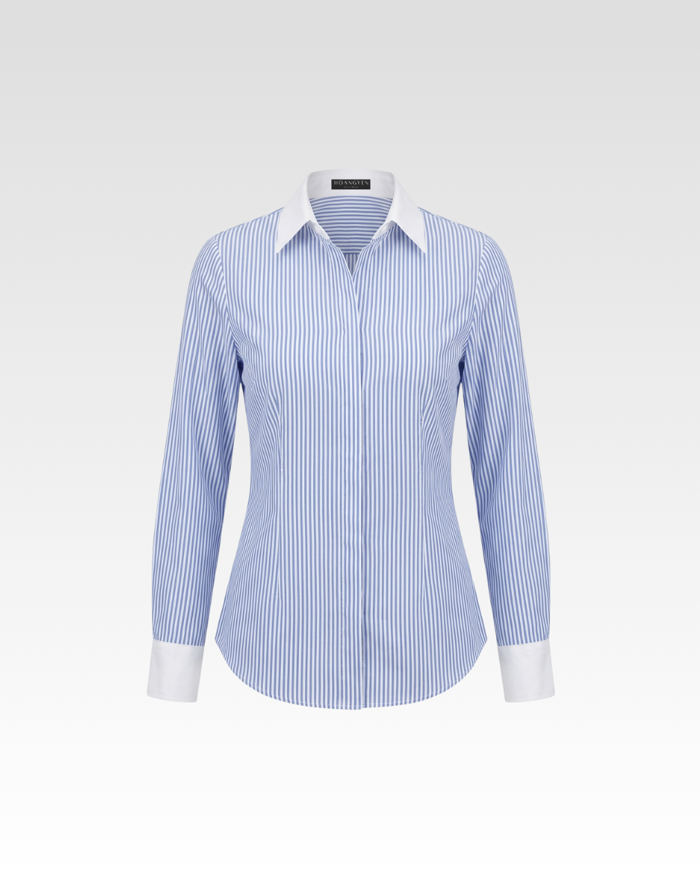 Áo sơ mi kẻ sọc xanh phối cổ áo và bo tay trắng