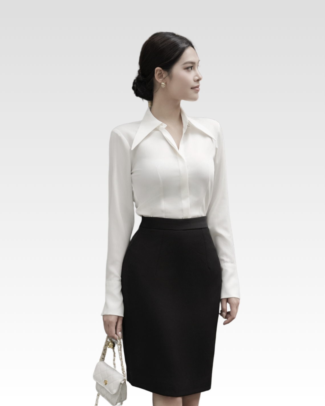 Áo sơ mi cổ nhọn phom ôm — sản phẩm được phối trong look này