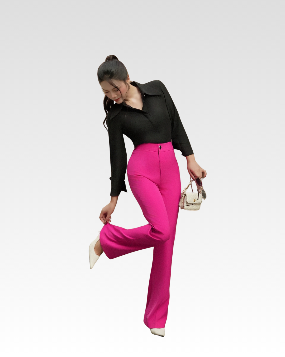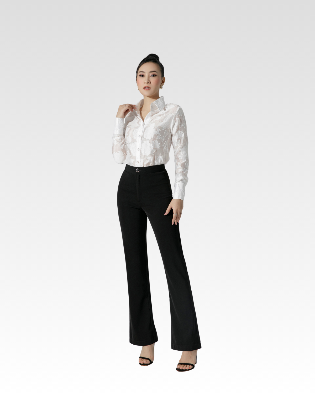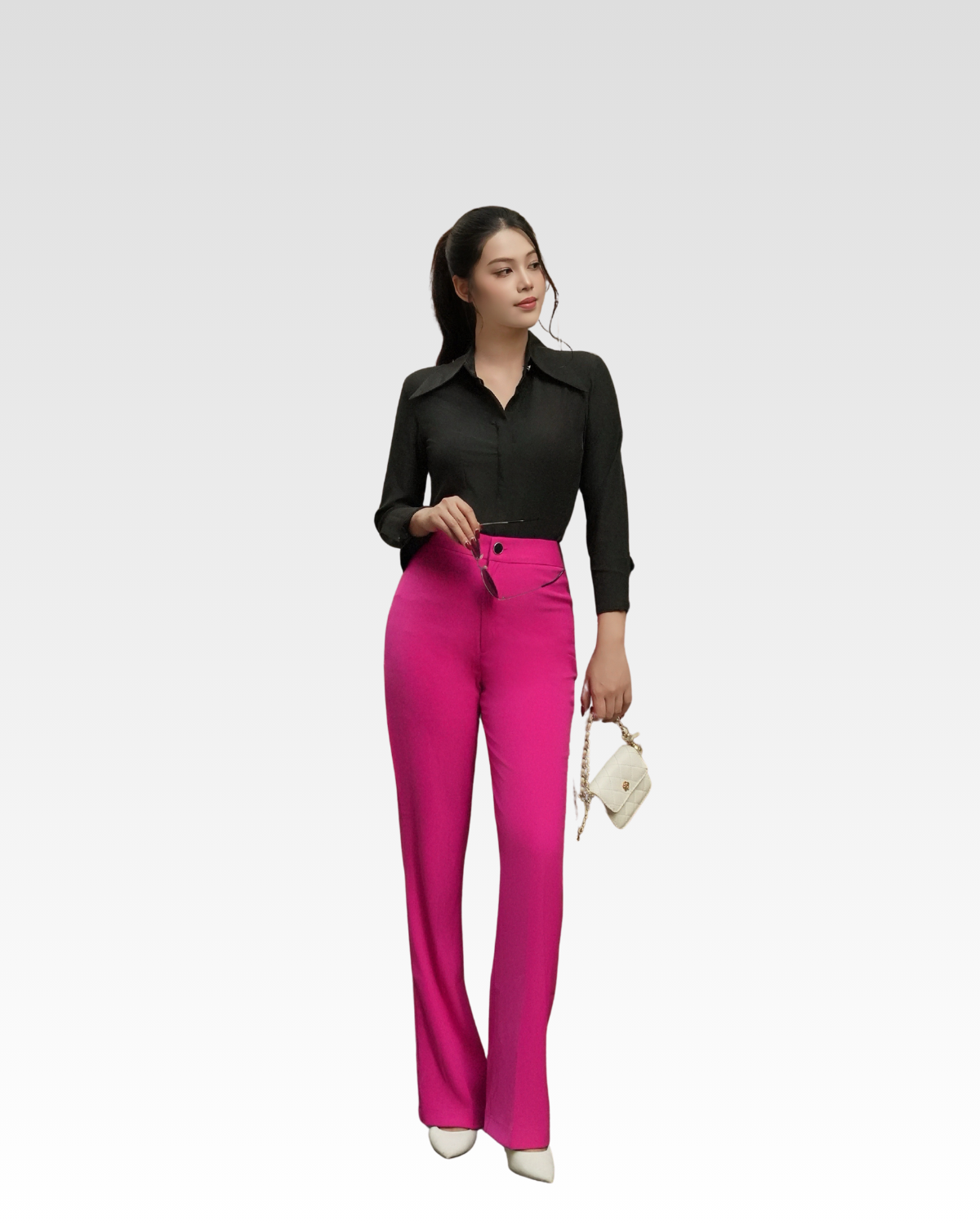 Áo sơ mi cổ nhọn vải chéo Ý — sản phẩm được phối trong look này